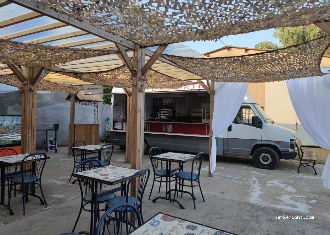 Located near electric vehicle charging stations, the site is served by a food truck open from 9 a.m. to 9 p.m. non-stop. The service includes breakfast, lunch, and dinner. Parking is free and secure for the night. A fee is required for water and electricity. A fishing site is nearby, as is the highway.