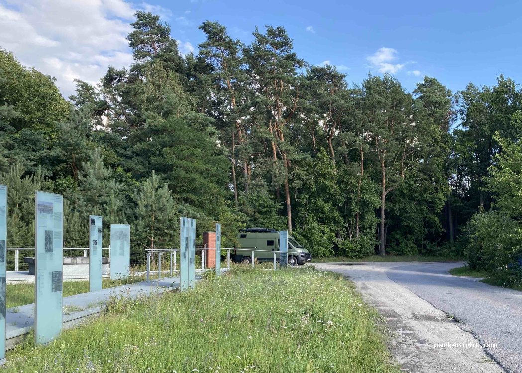 Geschichtsträchtige Umgebung. Guter Platz im grünen, wir haben hier eine Pause gemacht. Haben weiter hinten in der Sackgasse gestanden. Ruhig, ein paar Radfahrende. Das Betonwerk am Ende der Straße öffnet Werktags um 7, wie es da mit der Ruhe ist, weiß ich nicht.