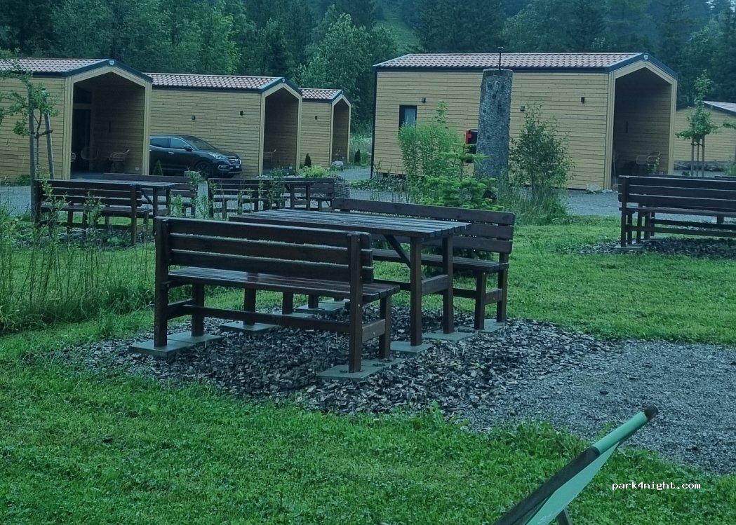 Camping en la naturaleza con varios chalets pequeños revestidos de madera natural. Rodeado de naturaleza.