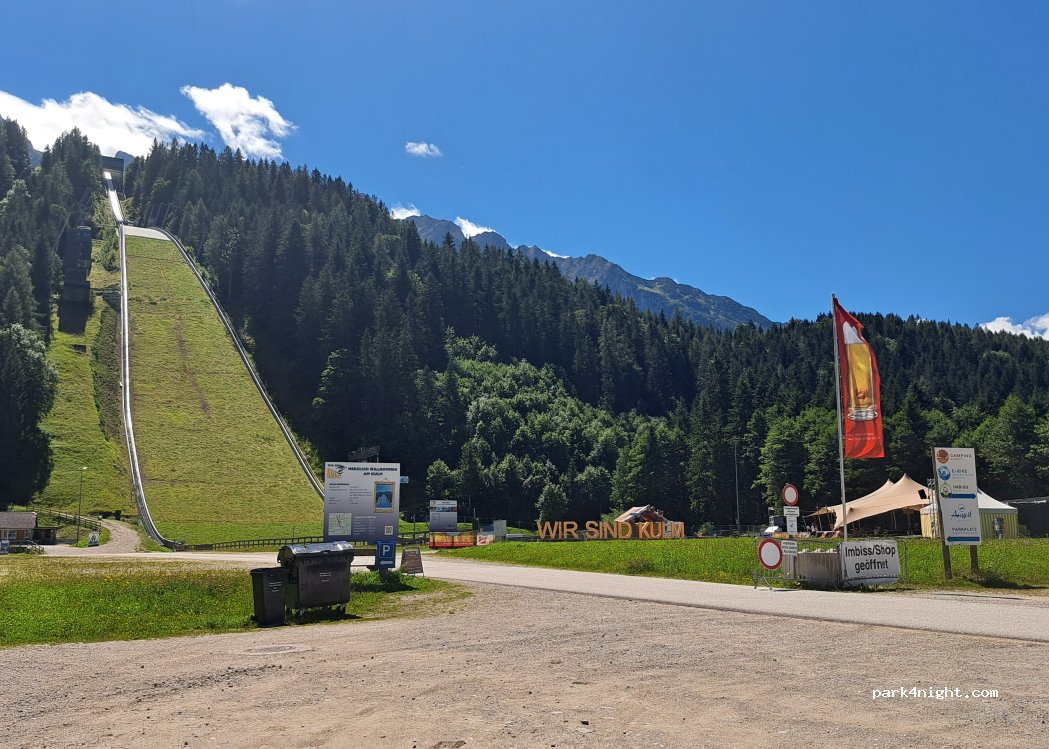 Parkplatz vor der Skisprungschanze. Imbiss vor der Schanze. Diese kann auf einem kleinen Rundweg besichtigt werden. Guter Zwischenstopp für Picknick und Bewegungspause.