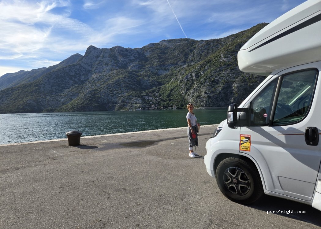 Parking du port, gratuit, partagé avec les voitures, accessible à tous les gabarits stabilisé et de niveau. Quasiment au centre du village ce stationnement est une excellente opportunité après la visite de Kotor ou les parkings autorisés aux camping-cars sont très rares et au prix du caviar !! Aucun service mais réception satellite et 4G optimale. Vue imprenable sur la baie de Kotor.