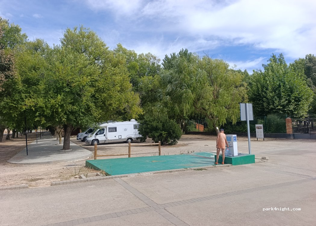 Petite aire en terre avec des arbres. Tables en bois à l'extérieur. Proche des sentiers de randonnée ou de vtt. Par contre, il y a du bruit, la route nationale passe devant, camions et engins agricoles. Services eau claire et eau usée propres. Nous avons passé une nuit en sécurité. Merci à la municipalité.