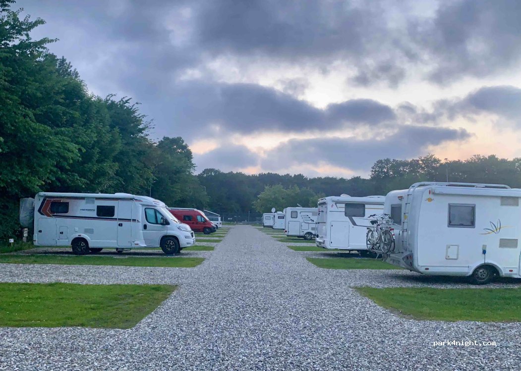 Cost 190 DKK for 2 for a night. Level pitch with electricity and water. Grey water and toilet disposal. Didn’t use the toilet/shower block. Rained and there was some surface puddles, but nothing dreadful. Our Ford managed it - and slides easily normally. Fantastic location for park and town. No security barrier.