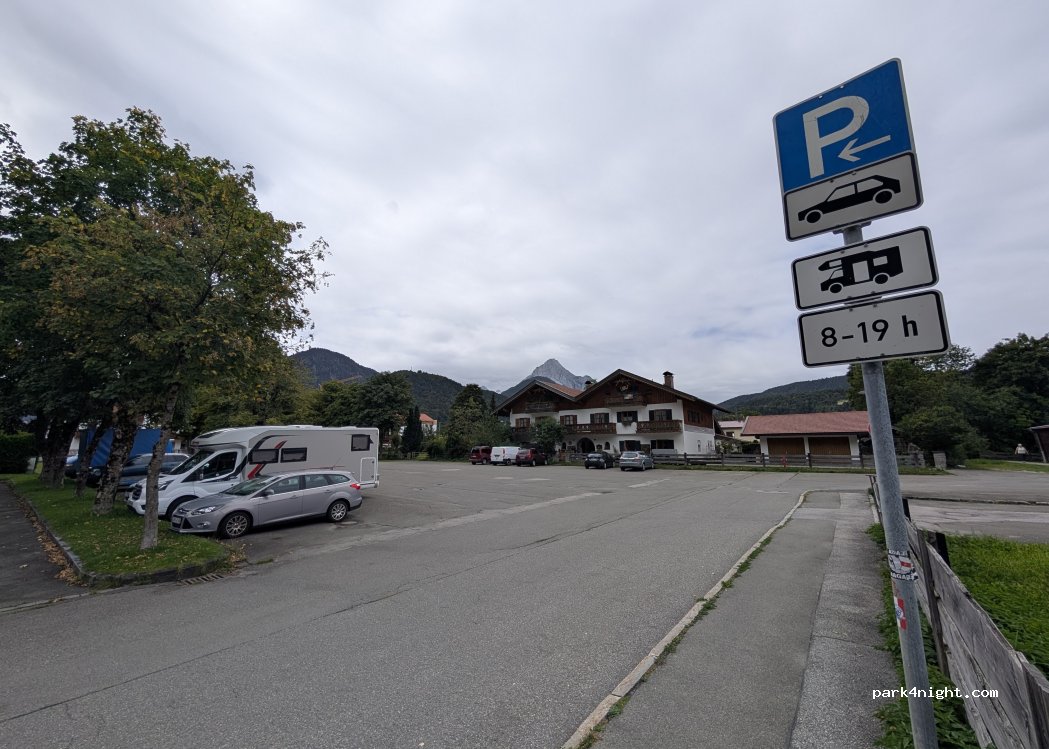 Daytime parking only. We parked here for a few hours to visit the town. It's a big free parking lot and a good option when the other free ones are full.