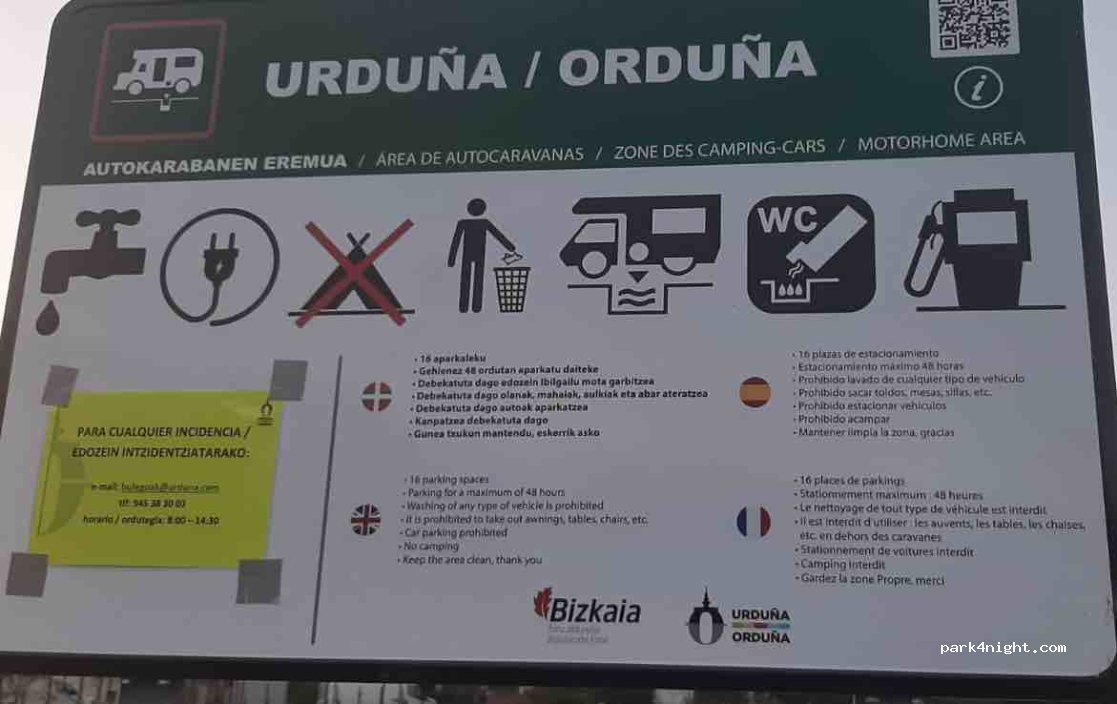 Nieuwe camperparking buiten het stadscentrum, met 16 plaatsen en een maximale autonomie van 48 uur. Luifels en tafels zijn niet toegestaan. Op 15 minuten lopen van het centrum van Orduña.