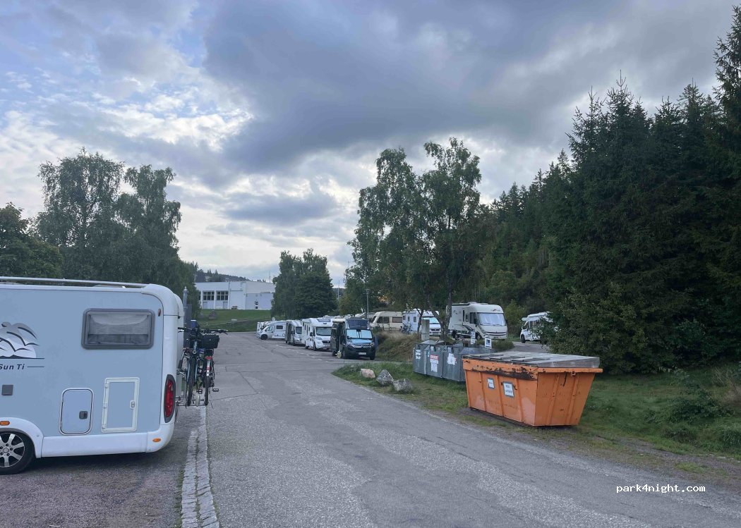 Parking algo inclinado junto al Area de pago. Noche tranquila junto a otras muchas autocaravanas. La zona de carga y descarga está en el área de pago. 1€ unos 100 litros de agua. Desde el pueblo salen senderos y muy cerca del lago. Gracias por el area.