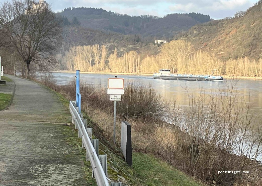 Schöner, geteerter Platz mit direktem Blick auf den Rhein für ca 5 Womos. Zufahrt eher nur für kleinere Camper.