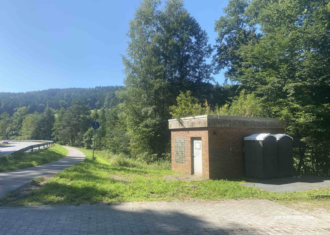 Aparcamiento público, varias plazas de aparcamiento, justo antes del cartel de la ciudad de Hüttenthal, por favor, manténgase limpio y compórtese apropiadamente, 2 baños portátiles en el lugar, sombra disponible gracias a los árboles altos.