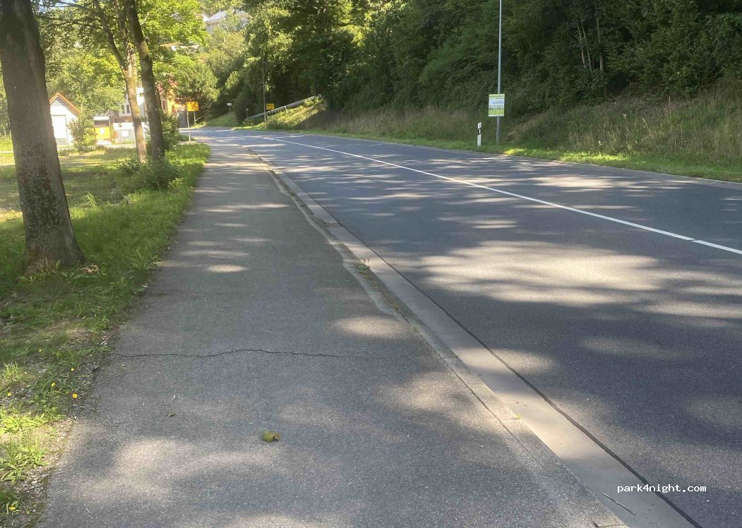 Parking public, plusieurs places de parking, juste avant le panneau de la ville de Hüttenthal, merci de rester propre et de vous comporter correctement, 2 toilettes portables sur place, ombre disponible grâce aux grands arbres