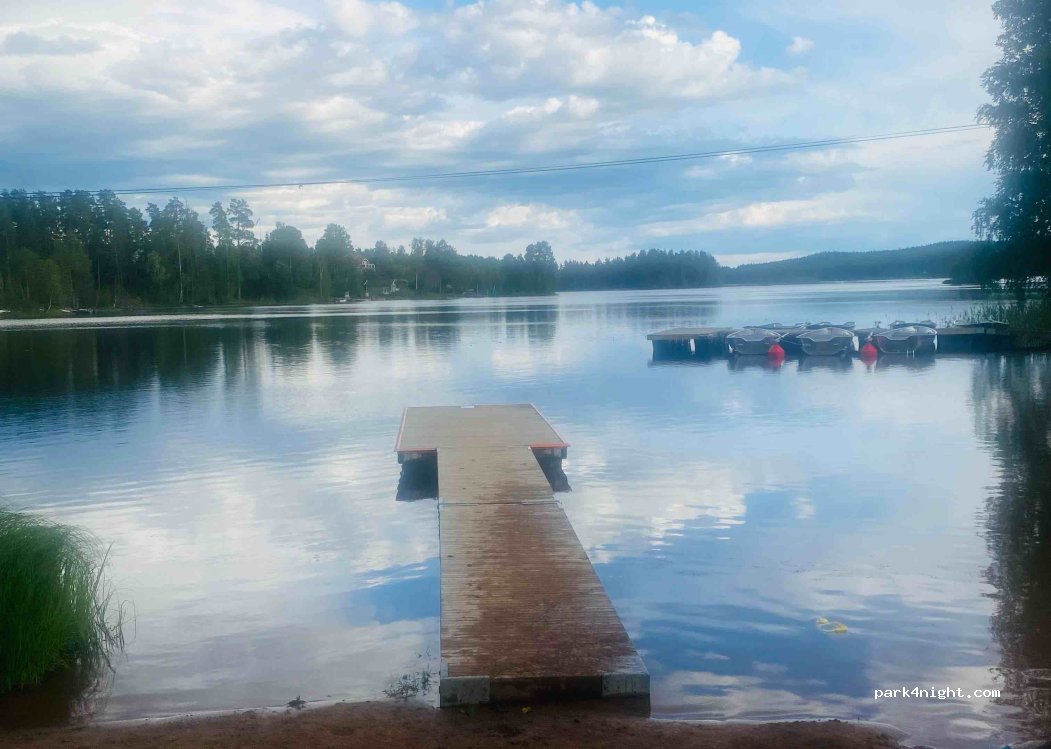 Très très bel emplacement, pratique pour aller à vélo jusqu'à la mine de Falun. Toilettes et café à deux pas, bateaux en prêt par la Maison de la Nature et baignade dans le lac sont très appréciés ! Attention toutefois, de nombreux événements sont organisés sur le site (soirée dansante le jeudi) les weekends.