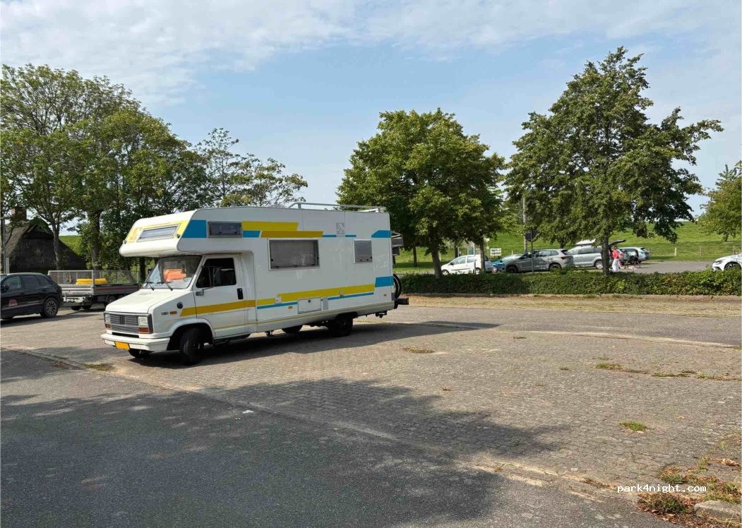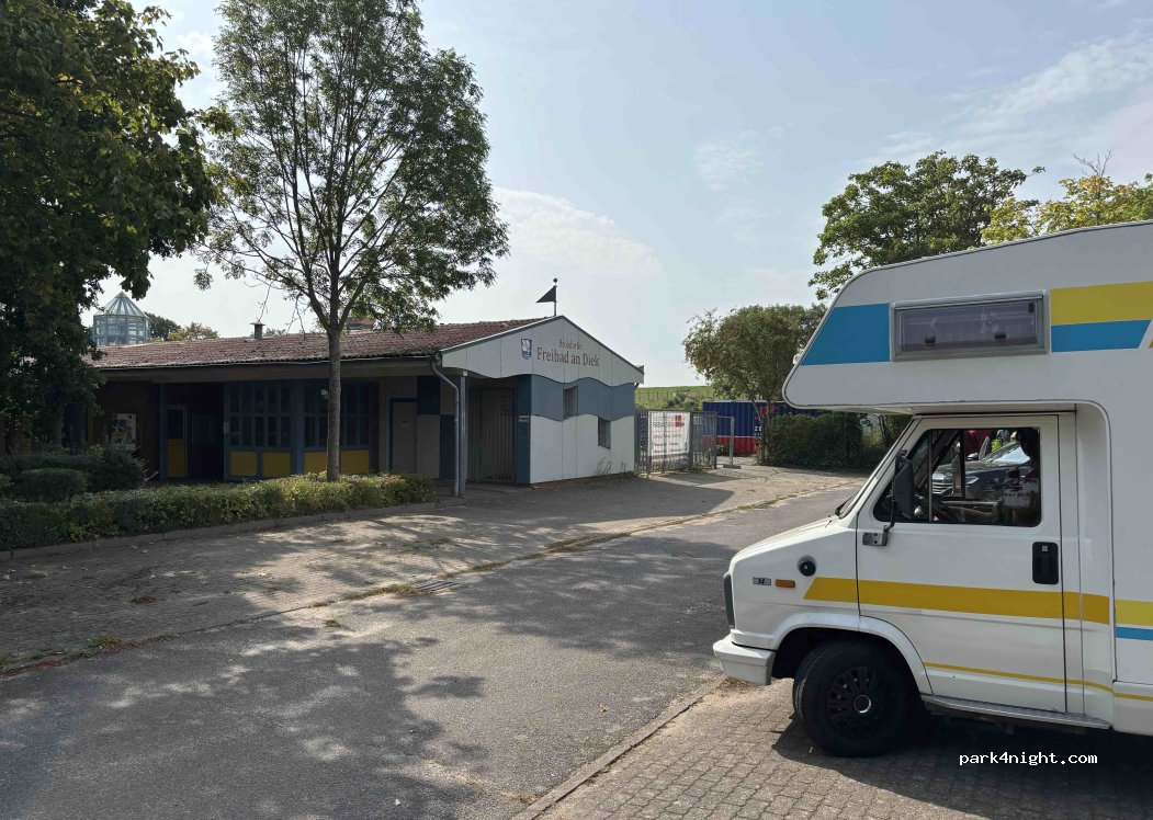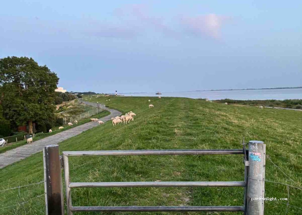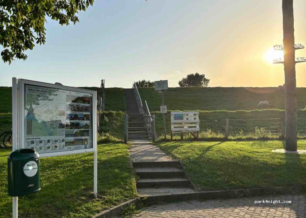 After taking the ferry from Wischafen to Glückstadt, we looked for a place to stay overnight. We finally found this spot next to the Brokdorf swimming pool, where it's supposed to be tolerated outside of opening hours. There's currently construction going on at the pool, so you shouldn't be in the way. The pool has clean restrooms that are always open, and you can fill up your water bottle there if needed. A really nice feature is that you can cross the sheep-lined dike to the beach! You can swim there.