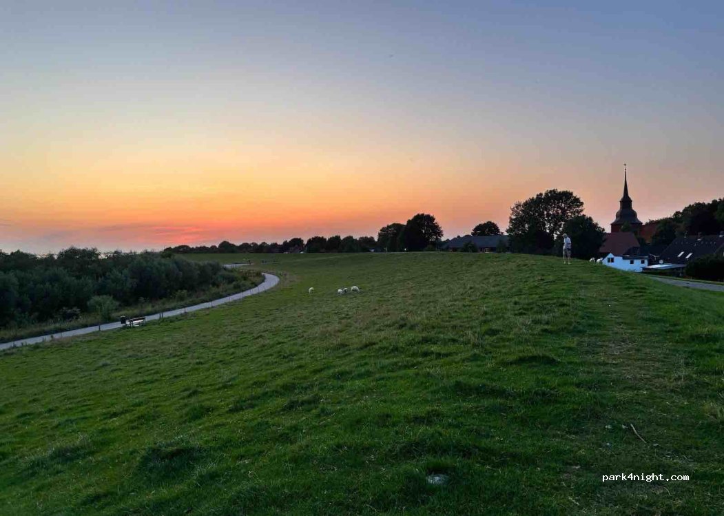 Después de tomar el ferry de Wischafen a Glückstadt, buscamos un lugar para pasar la noche. Finalmente encontramos este sitio junto a la piscina de Brokdorf, donde se supone que se puede nadar fuera del horario de apertura. Actualmente hay obras en la piscina, así que no deberías molestar. La piscina tiene baños limpios que siempre están abiertos, y puedes llenar tu botella de agua allí si lo necesitas. ¡Una característica muy agradable es que puedes cruzar el dique rodeado de ovejas hasta la playa! Allí se puede nadar.