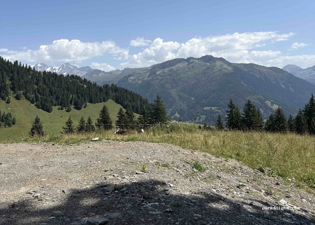 Au bord de la route avec du passage mais idéal pour manger avec un petit coin à l’ombre vers 13h30 l’été . Vue sur les aiguilles des glaciers.