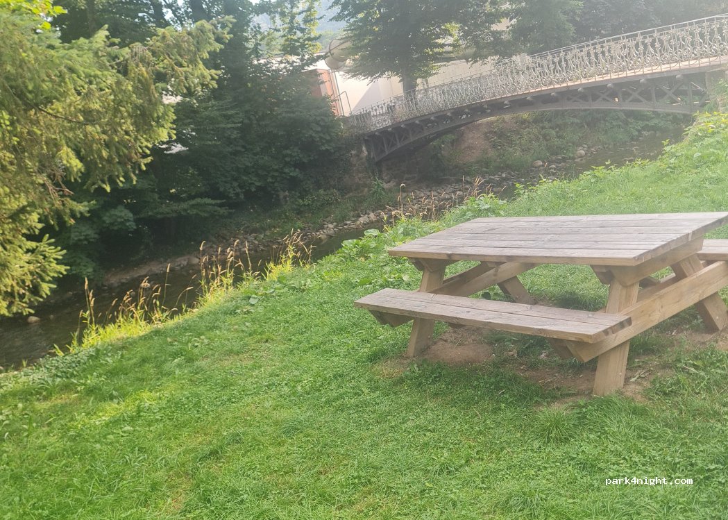 Endroit paisible au bord d'une rivière possible de s'y baigné il y as une piscine à 1 min à pied (payante) pas de poubelle parc à 5 min à pied