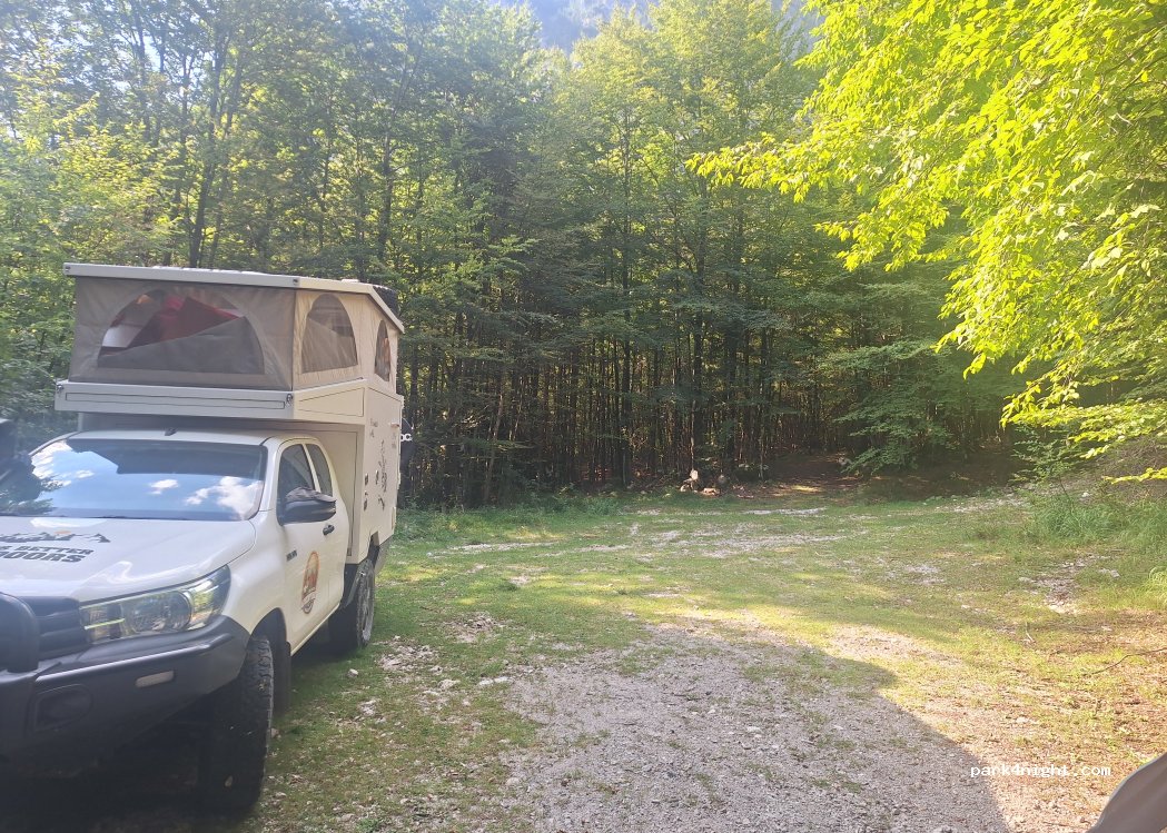 Heel stille open plek in een bos. Waarschijnlijk enkel bereikbaar in zomermaanden, want je moet een rivier doorkruisen (droog in de zomer). 4x4 sterk aangeraden, want de piste ernaartoe is steil en soms met los grind. Zeker niet doen met grote campers.