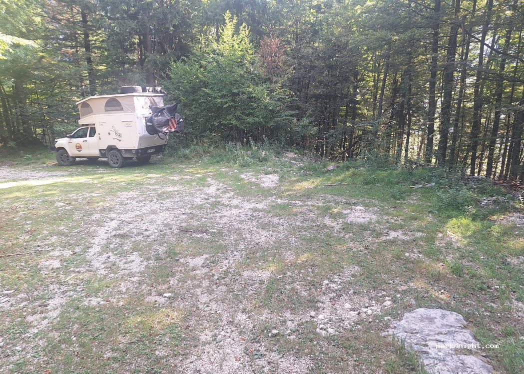 Open plek met platte stukken. Hier passeert niemand, de bosweg verandert hier in een 4x4 piste. Goed gsm bereik. Gewone kaarten (zoals google maps) tonen mogelijk de piste niet, gebruik een detailkaart app zoals komoot, gaia gps of dergelijke. Kom aanrijden uit noordelijke richting, de andere wegen op de kaarten bestaan niet of zijn onbereidbaar.