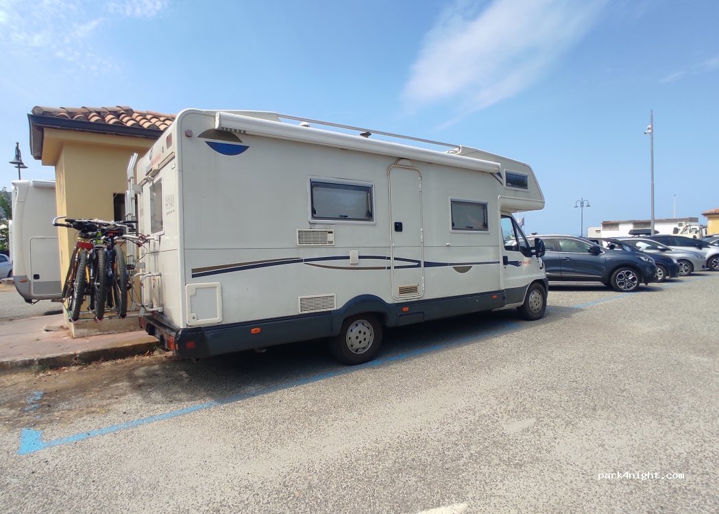 Zambrone Marina parking lot. Direct access to the beach, two sufficiently long RV spaces on either side of the restroom block, for campers up to 7 meters. Wonderful beach, both public and private. Bar and restaurant nearby. Enter the seafront following signs for Zambrone town center to avoid a potentially problematic underpass.