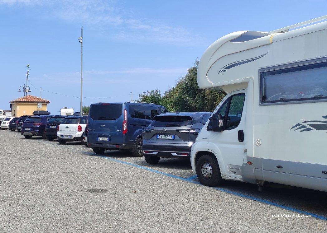 Parcheggio grande a pagamento ma con alcuni parcheggi gratuiti! Abbiamo dormito 3 notti (parcheggi bianchi) e non abbiamo avuto nessun problema, la polizia passa tutti i giorni mattina e sera per controllare! Ci hanno detto che non c’era nessun problema se passavamo la notte qua e semplicemente di rispettare le norme! Nel parcheggio ci sono telecamere di sicurezza ed è illuminato!