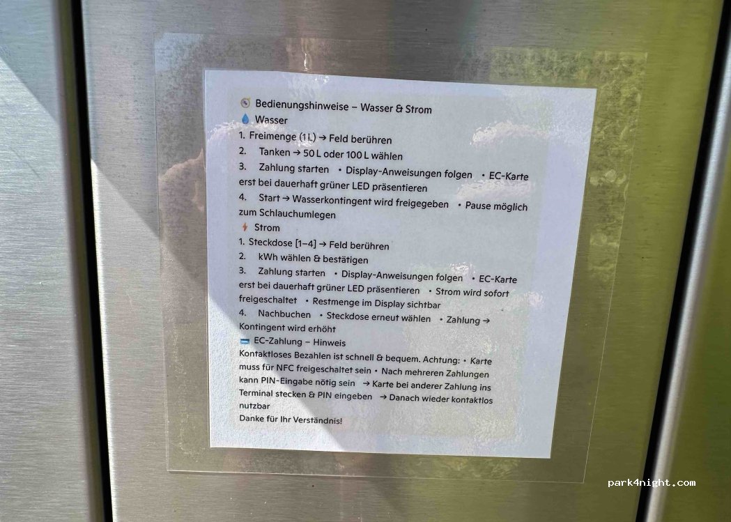 Ja auch von uns ,herzlichen Dank für diesen schönen Stellplatz und Service. Es ist alles schön sauber und funktioniert gut,bis auf das Wasser ,das war wohl abgestellt ,hatte 1€ hineingeworfen,aber der Wasserhahn ließ sich nicht bewegen. Allerdings gab es keinen Hinweis .