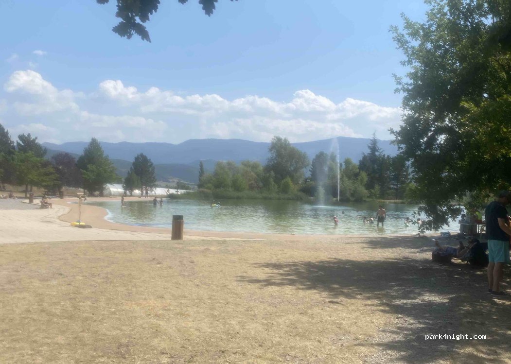 Une barrière à l entrée du parking est fermée en dehors des heures de baignade .. merci de respecter le lieu .. car il est magnifique et par temps de canicule pouvoir se baigner gratuitement est un luxe .. petit bar dans l enceinte du lac artificiel et petit snack .. le top