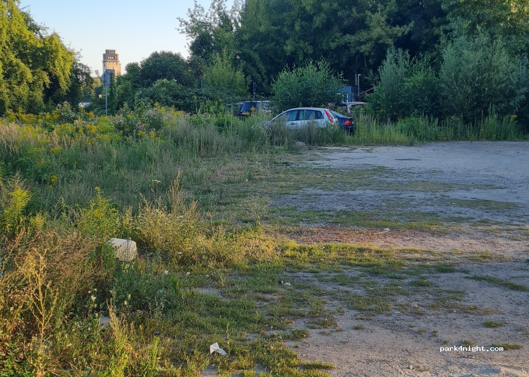 Estacionamiento de grava cerca de la estación de tren, justo en el agua.