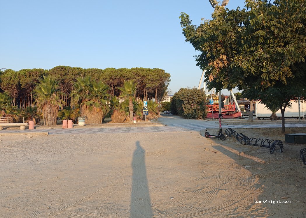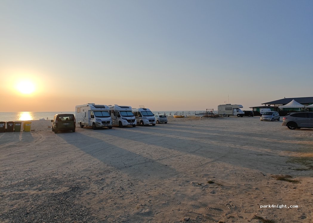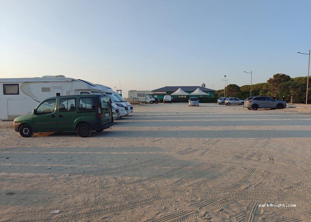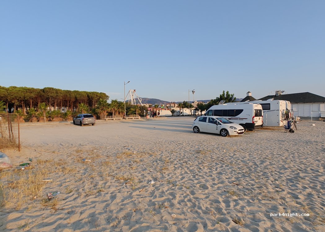 Parcheggio gratuito sulla spiaggia, presenti bidoni dell’umido. Di facile accesso e con presenza di altri camper, un po’ rumoroso per via delle giostre ma approvato.