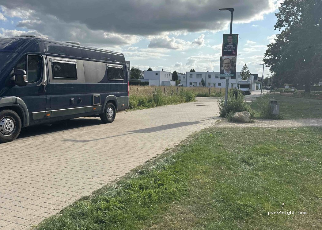 Parkplatz in einem Wohngebiet an einem kleinen Park mit Spielplatz. Gut für eine Pause. 2,5km von der Autobahn entfernt.