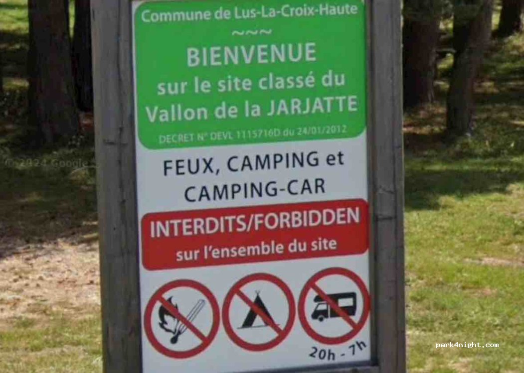 Site classé = nuit interdite. Des panneaux rappellent l’interdiction à l’entrée du site. Un peu de bon sens et de respect. De toute façon le chemin d’accès est mauvais et étroit.
