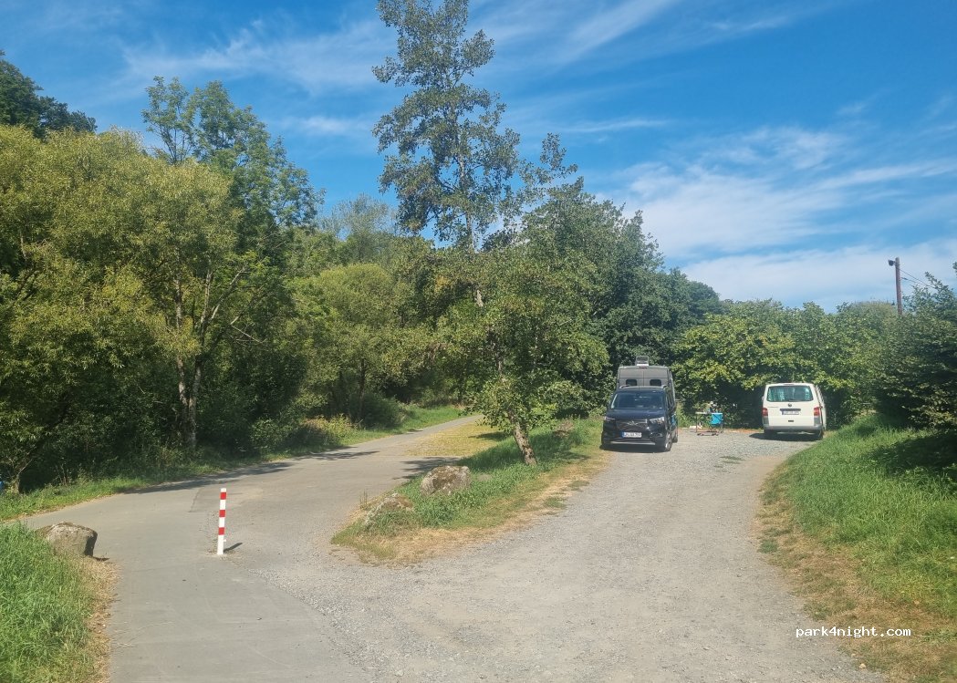 Gravel parking lot at the end of a long one-way street directly on the Lahn Cycle Path, next to the sports field.