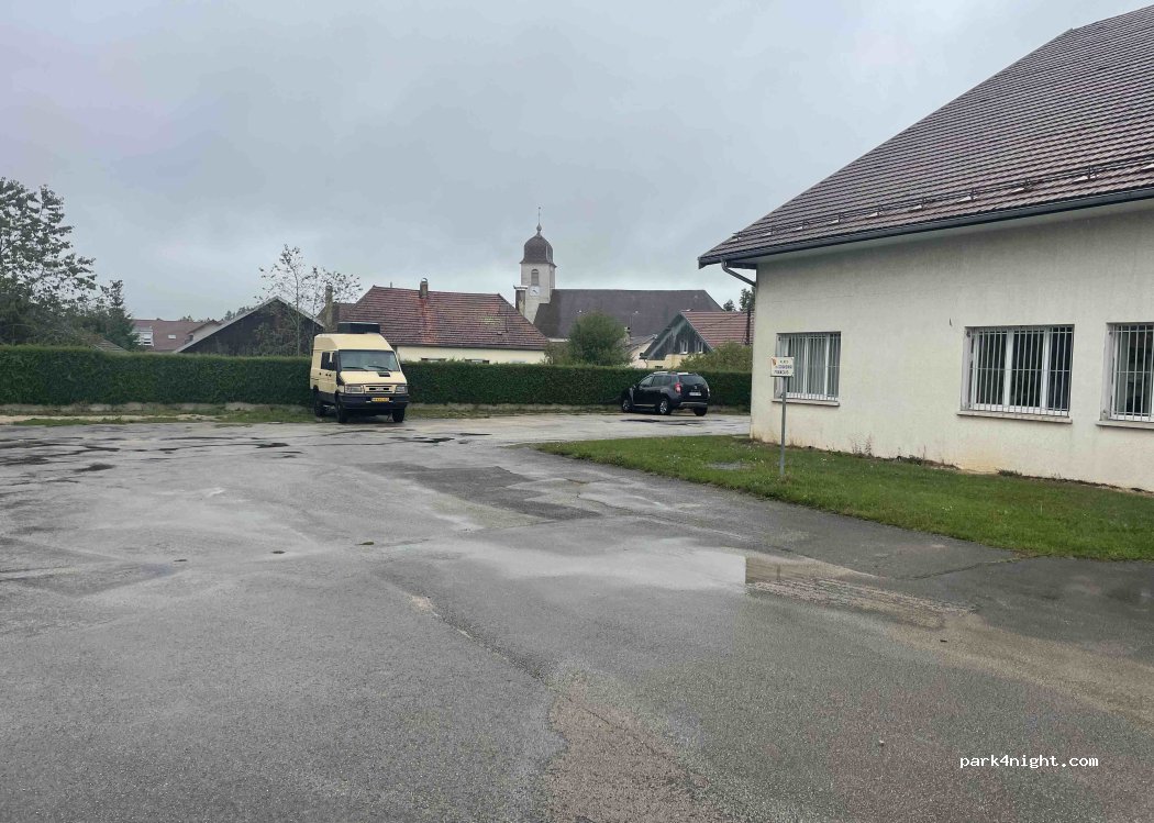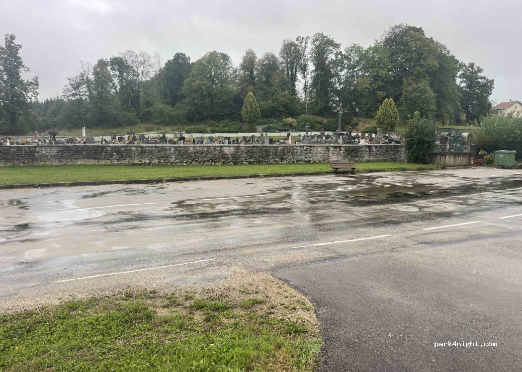 Bon endroit pour une nuit. Proche du centre-ville. Assez loin du clocher de l'église. Deux boulangeries à proximité. Toilettes publiques luxueuses derrière l'église (du côté du toit en pente). Agréable et calme à côté du cimetière.