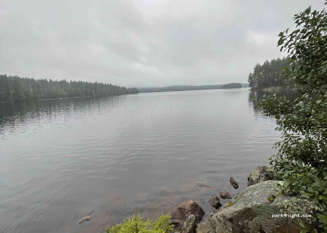 Beautiful, secluded spot by a lake. Two fire pits and a shelter are available. Three to four vans or two expedition vehicles can easily fit there. A sign indicates that this is a local fishing spot (permit required). An incredible number of mushrooms grow in the woods.