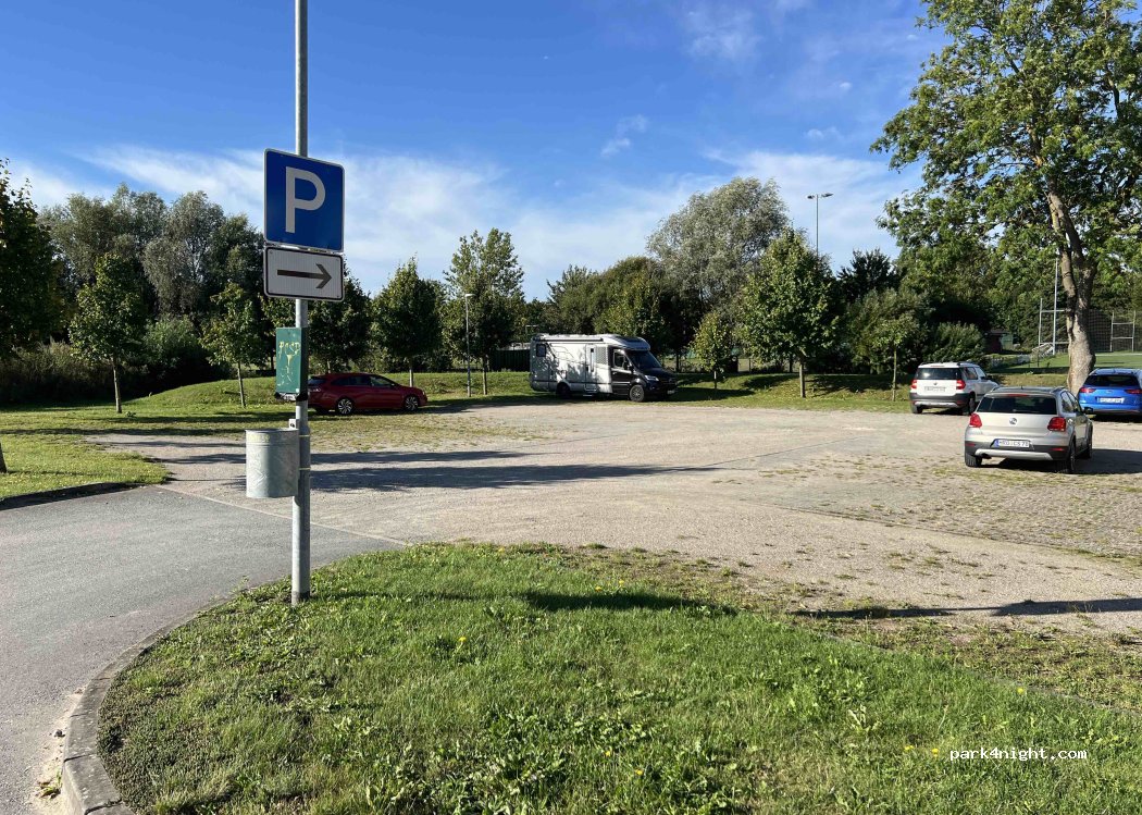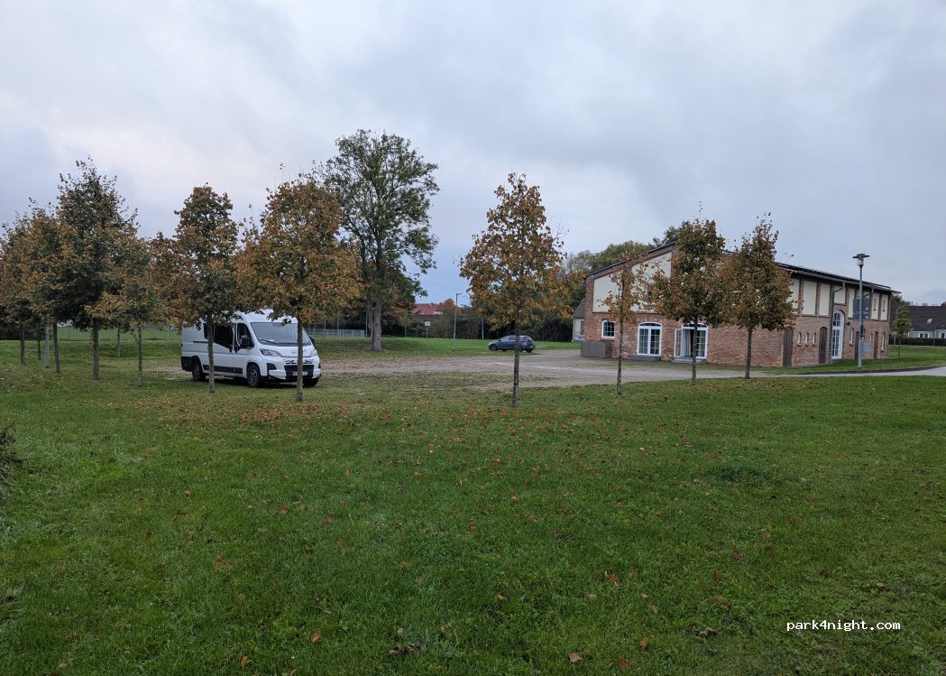 Public parking behind the Kulturscheune (cultural barn). Level and paved with grass pavers. No interdiction against parking. We slept peacefully one night. During events at the Kulturscheune, it can be loud, and the parking lot can be full.
