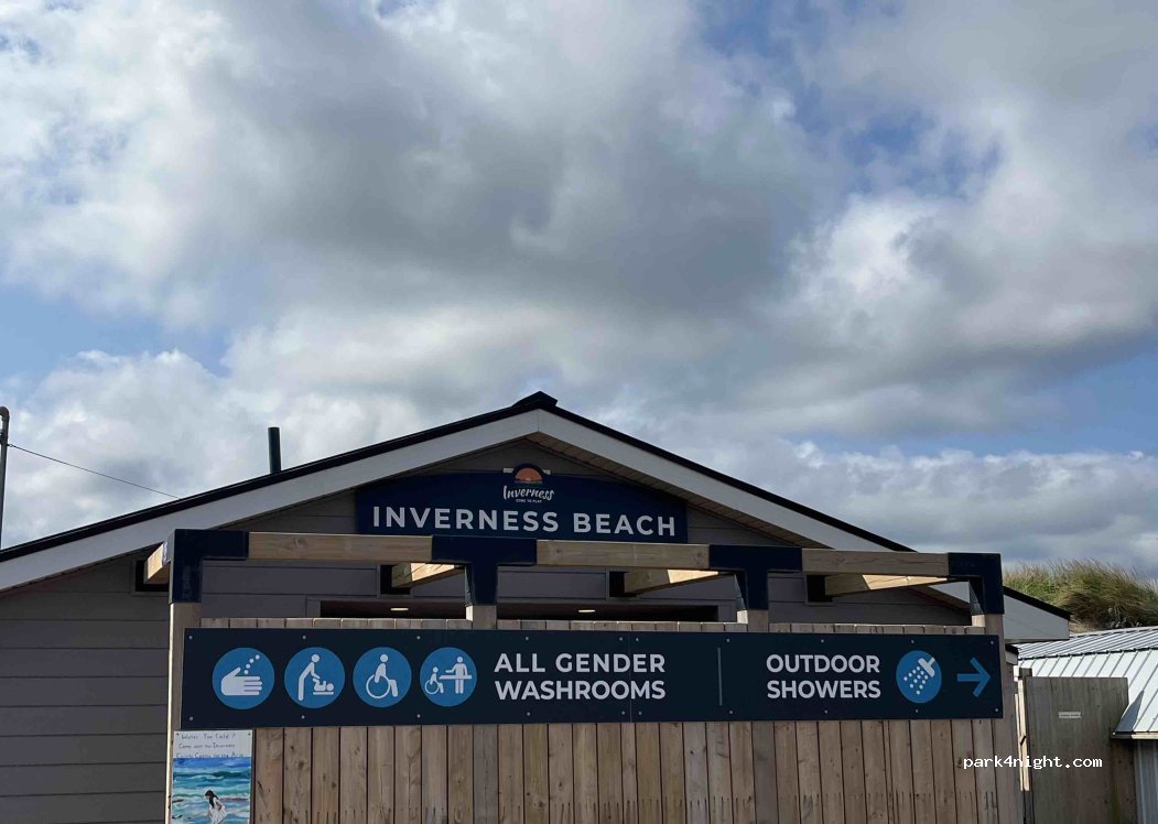 Outdoor showers and toilets at Inverness Beach. Daytime parking.