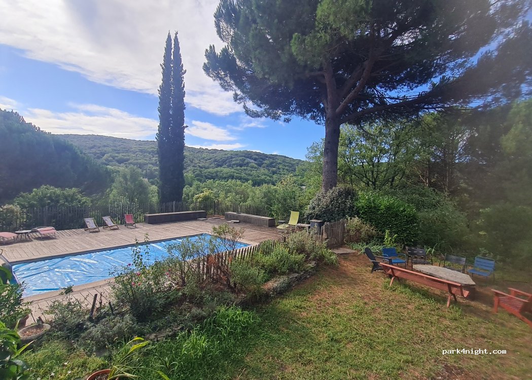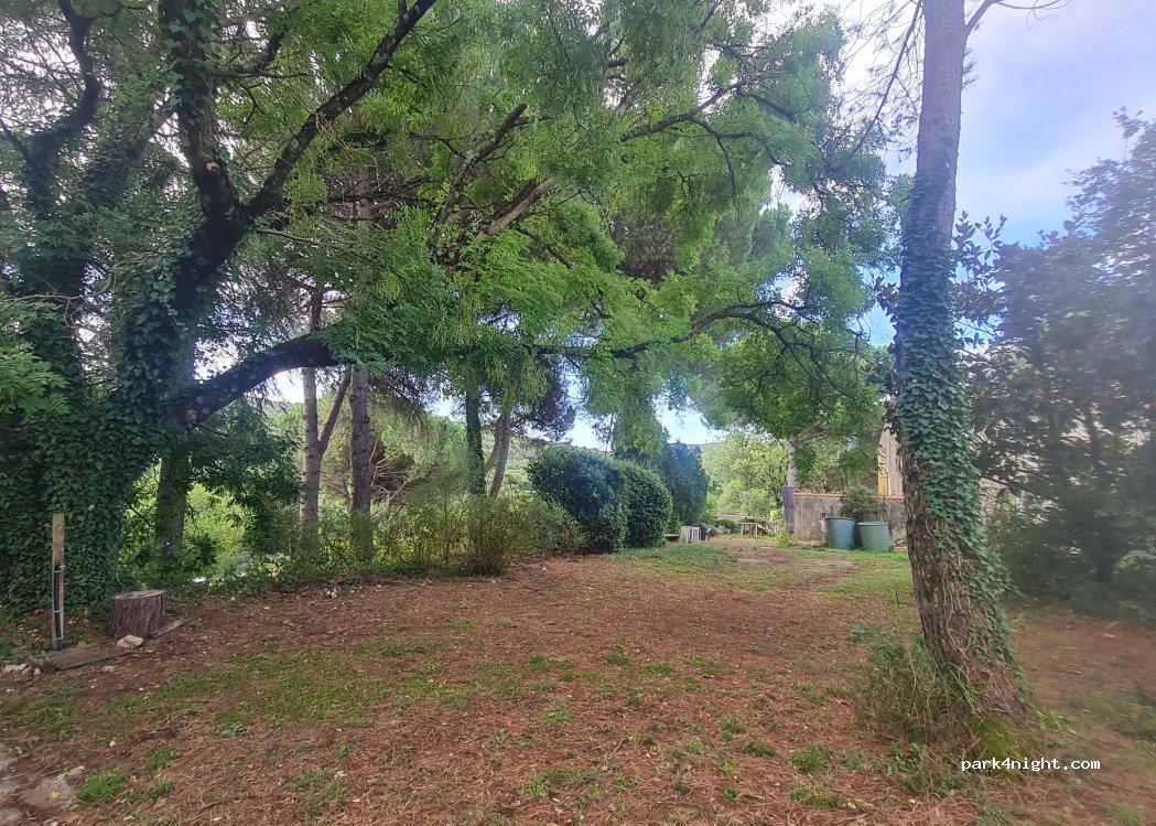 Zone arborée sur 1ha, très calme, avec vue sur la garrigue. Toilettes sèches, douches extérieures en été, accès piscine.