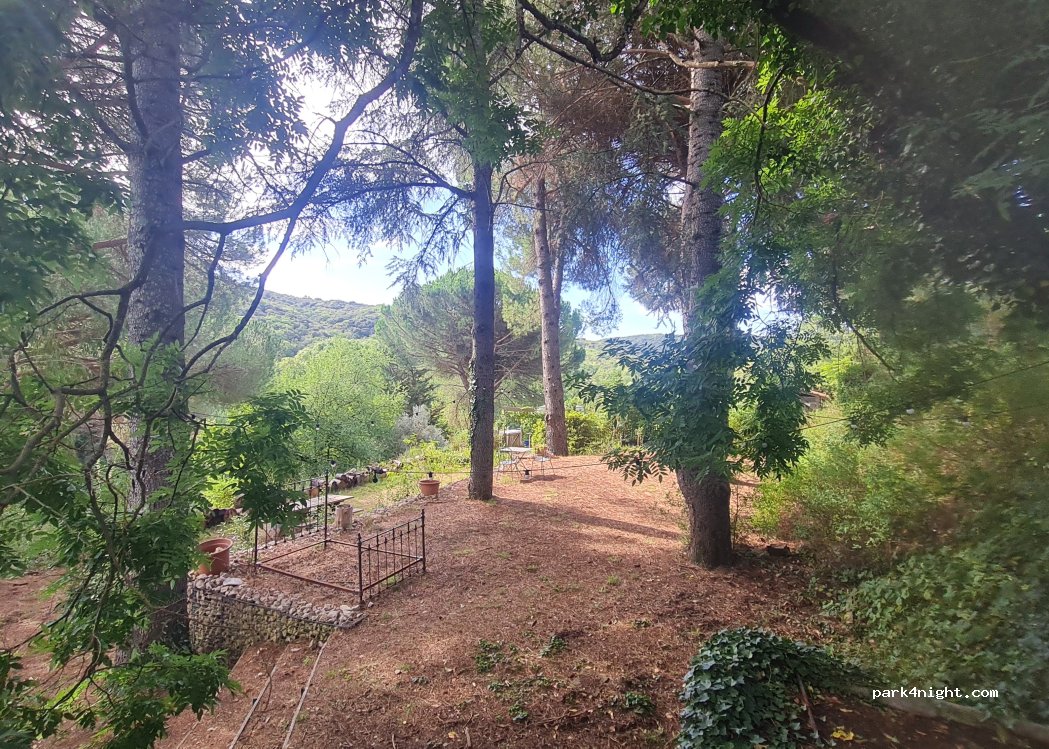 Very quiet, wooded area covering 1 hectare, with views of the scrubland. Dry toilets, outdoor showers in summer, swimming pool access.