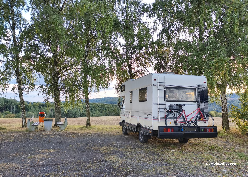 Großer Schotterparkplatz am Ortsausgang. Picknickbank, Mülleimer sowie Altkleider- und Glascontainer vorhanden. Abendsonne und Sonnenuntergang.