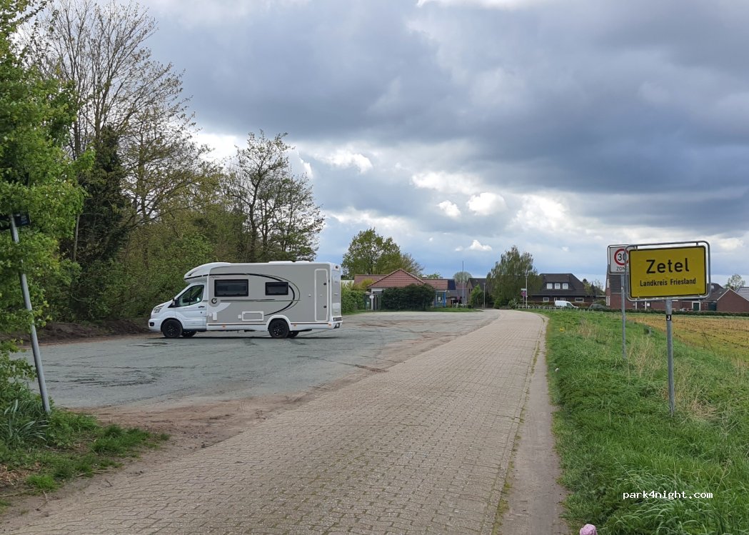 Einfacher kostenloser offizieller Ganzjahresstellplatz direkt am Natur-Schwimmbad. Abend und Nachts sehr ruhig. Im Sommer tagsüber viel Parkplatzverkehr. Platz befindet sich am Ortsrand von Zetel.