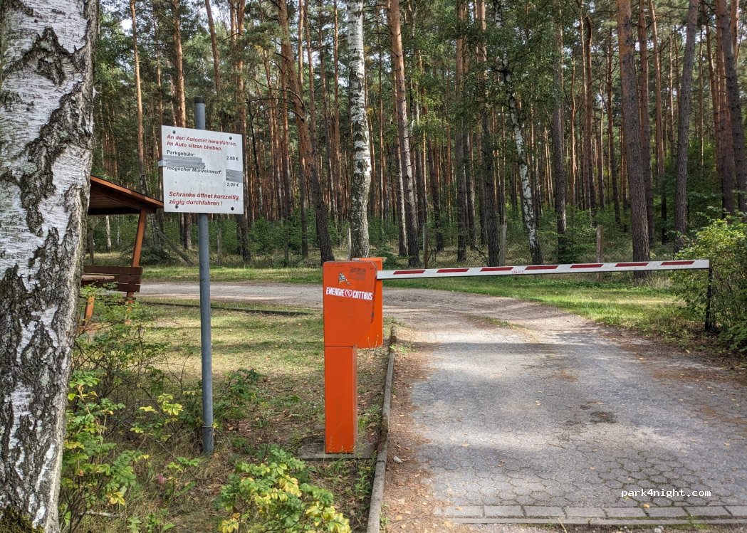Parking à Briesensee avec barrière, le lac est de l'autre côté de la rue.