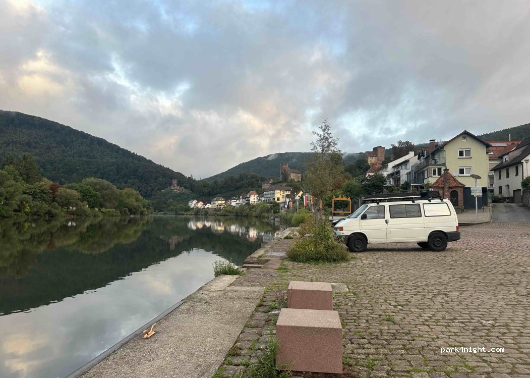 Zentral direkt an der Neckarpromenade gelegen. Restaurants und Kinderspielplatz in der Nähe. Einfach dem Neckar folgen. Toller Blick auf die vier Burgen. Sehr ruhige Nacht. Platz mit Kopfsteinpflaster.
