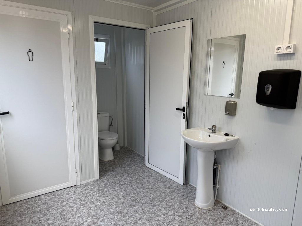 Camperplaats met 63 staanplaatsen, elektriciteit, drinkwater, lezing van zwart- en grijswater, wifi, toiletten en douches, omheind en beveiligd terrein.