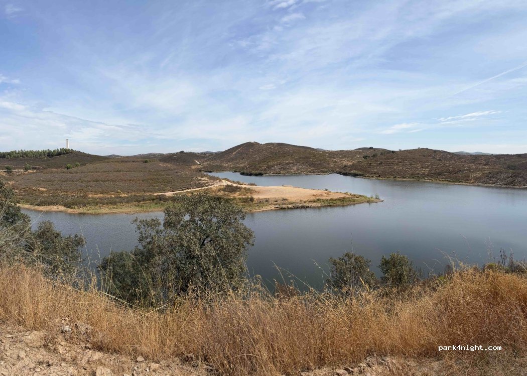 We tried to go to the higher point, but the GPS led us here. It's a bend or siding off the main dirt road, very close to a kind of natural bridge. A very quiet spot, with only two or three cars (probably fishermen) passing by. The spot is flat, but with relatively difficult access via a dirt path. Great views of the reservoir. Poor coverage and virtually no internet.