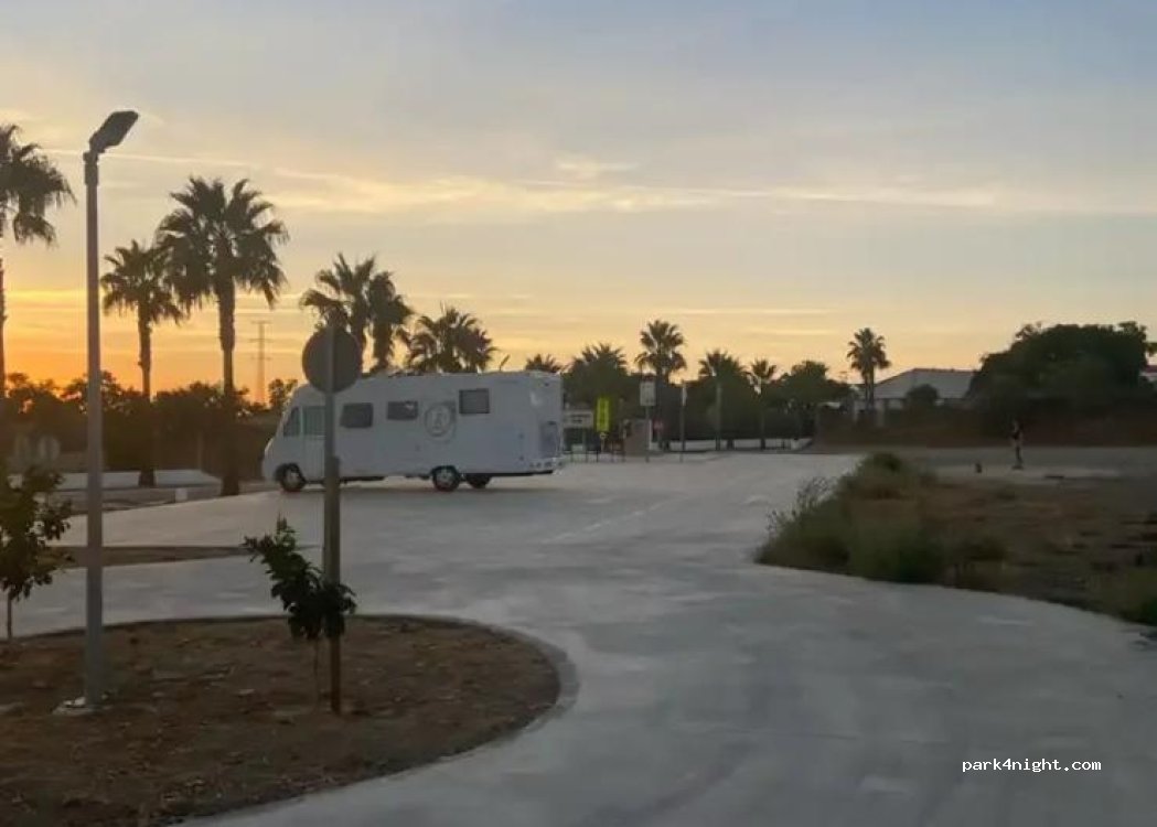 Great stopover. 5 marked pitches but you could easily park 10 more on the unmade ground. Two 16amp free electric points on the services terminal. Everything very new. Easy walk into the small town. Great walk in the hills above to see the windmills. Thankyou to the town. The road is close by but we slept well.