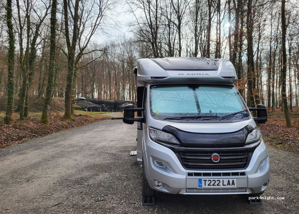 parking dans la forêt a côté de l'entrée du fort de schoenenbourg, ligne Maginot. dormi sur place arrivé la veille. nuit au calme,en légère pente mais une fois calé pas de soucis. quelques passages sur la route a côté mais sans gêne pour dormir. visite de la ligne Maginot, vraiment a faire,très intéressant. attention faut marcher et bien se couvrir, pas plus de 12° a l'intérieur. durée -2h30