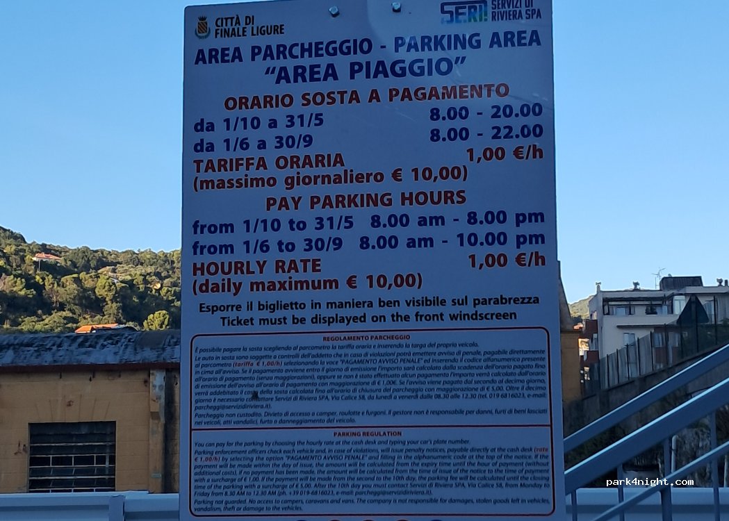 Abbiamo pernottato una notte. In questo periodo il parcheggio era abbastanza vuoto, con stalli occupati uno sì e uno no. Immagino che in periodi di maggiore affluenza si stia un po' stretti. Notte tranquilla. In bici 10 minuti per raggiungere Finalborgo (da vedere!), anche se non c'è una ciclabile ma solo strada a senso unico.