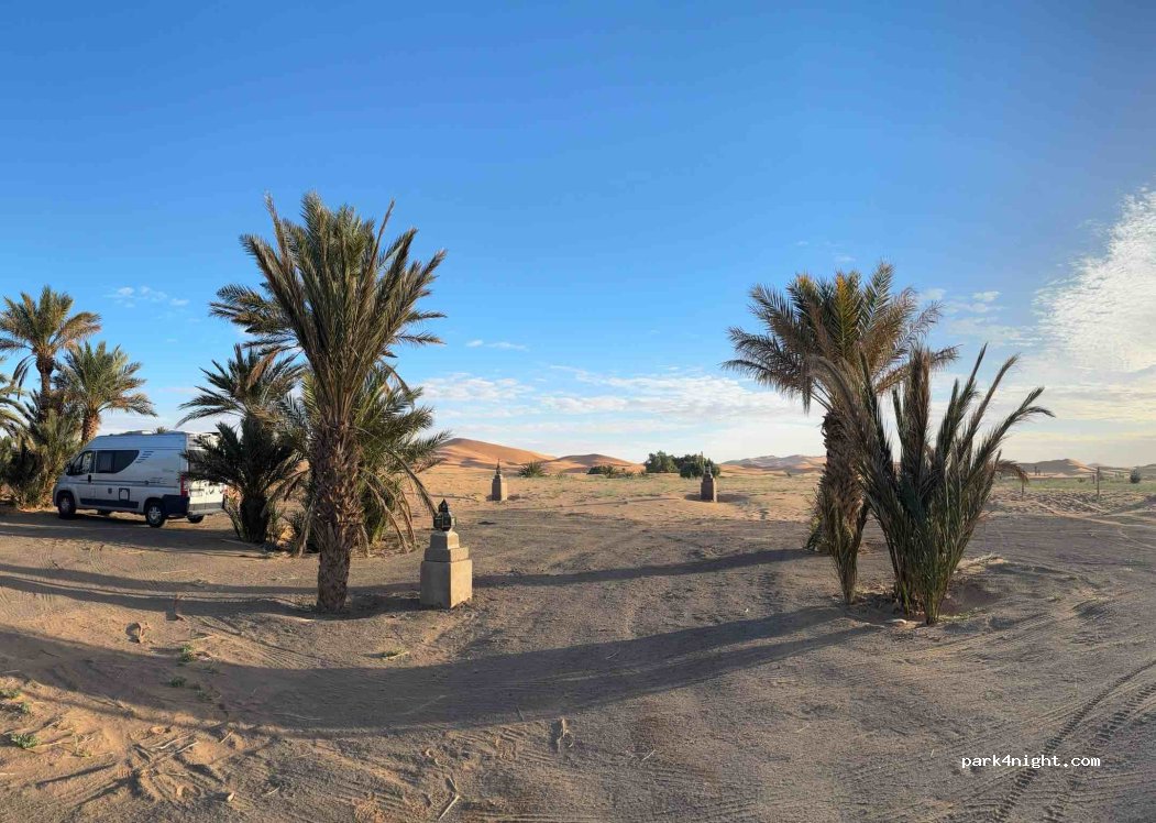 Alle Annehmlichkeiten sind vor Ort, inkl. Tollem Blick auf die Sandberge. Unsere Wäsche wurde für 50MAD pro Maschine super gewaschen und wir haben ein leckeres Abendessen ans WoMo geliefert bekommen. Ibrahim war super nett und sehr hilfsbereit. Achtung, Untergrund teilweise weich. Niemand war aufdringlich, wir haben uns sehr wohl gefühlt. Nacht kostet 100MAD pro Fahrzeug pro Nacht, inkl. Strom.