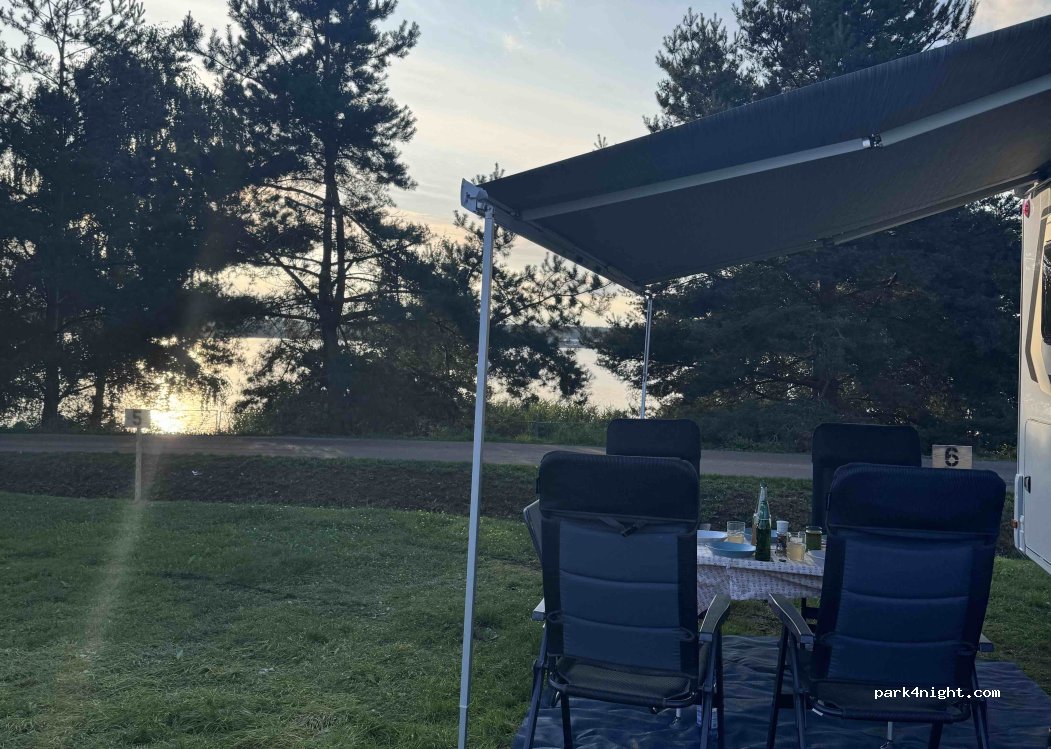 Das ist einer der schönsten Stellplätze die wir bisher gesehen haben. Direkt am See mit herrlichem Blick auf den Sonnenuntergang. Kiosk am Platz mit Getränken und Kleinigkeiten zum Essen. Die WC‘s werden gerade gebaut. Fahrradwege in direkter Nähe. Bäckerei mit Lebensmitteln in ca. 1 km.
