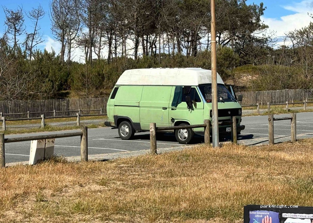 Perfect position for beach, sunset to die for - drew loads of people from nearby campsite just to sit on beach to watch sunset, perfection ! 2m height barrier on car park, but plenty of space. Outside beach shower - says no soap, but plenty of people were. Toilets during the day but closed overnight. Lifeguarded beach, again during day until 7pm (may vary). Shop, boulangerie, and quiet bars/restaurants, surf/sup hire by car park. Spent a quiet night here, slightly noisy to start with due to party on beach from people staying in nearby campsite but not enough to keep you awake, make you feel unsafe, or to put me off returning. Will definitely be back when surf's better
