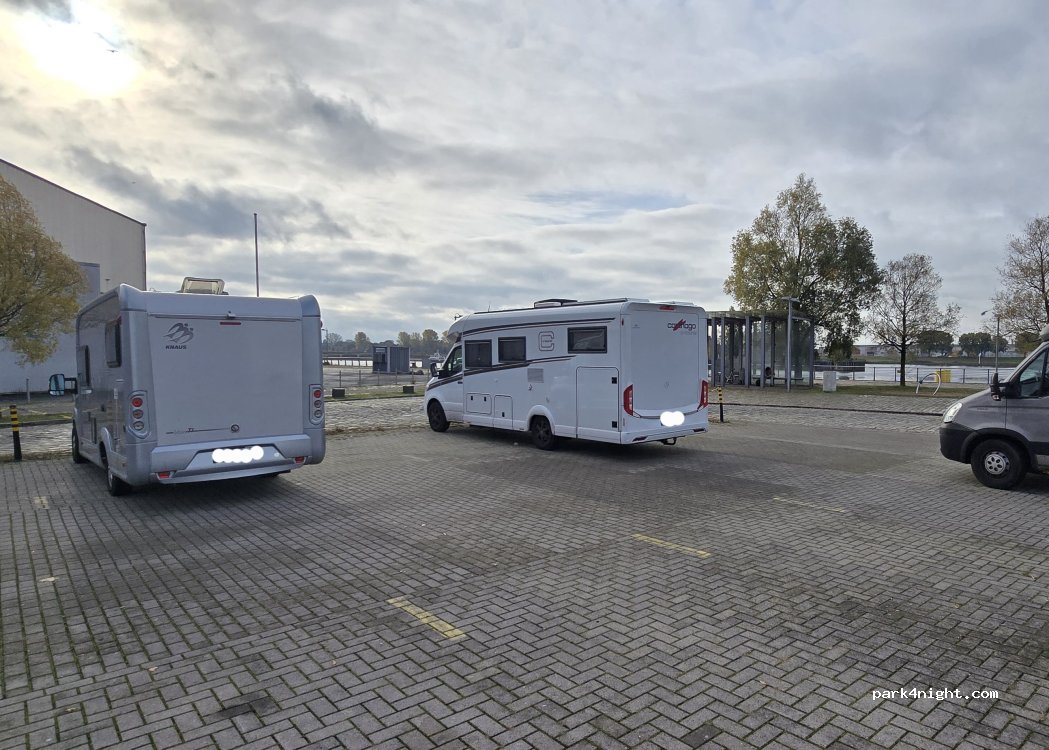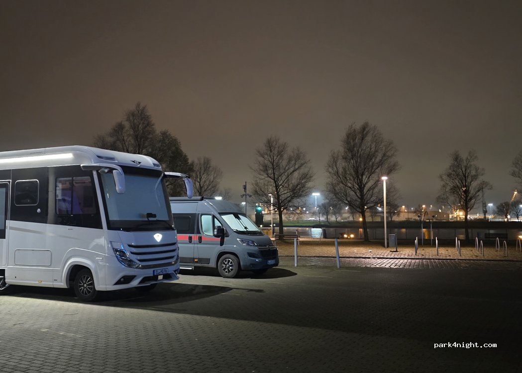 Parking au bord de la rivière Weser. Très bel endroit pour passer la nuit, avec boutiques et restaurants.