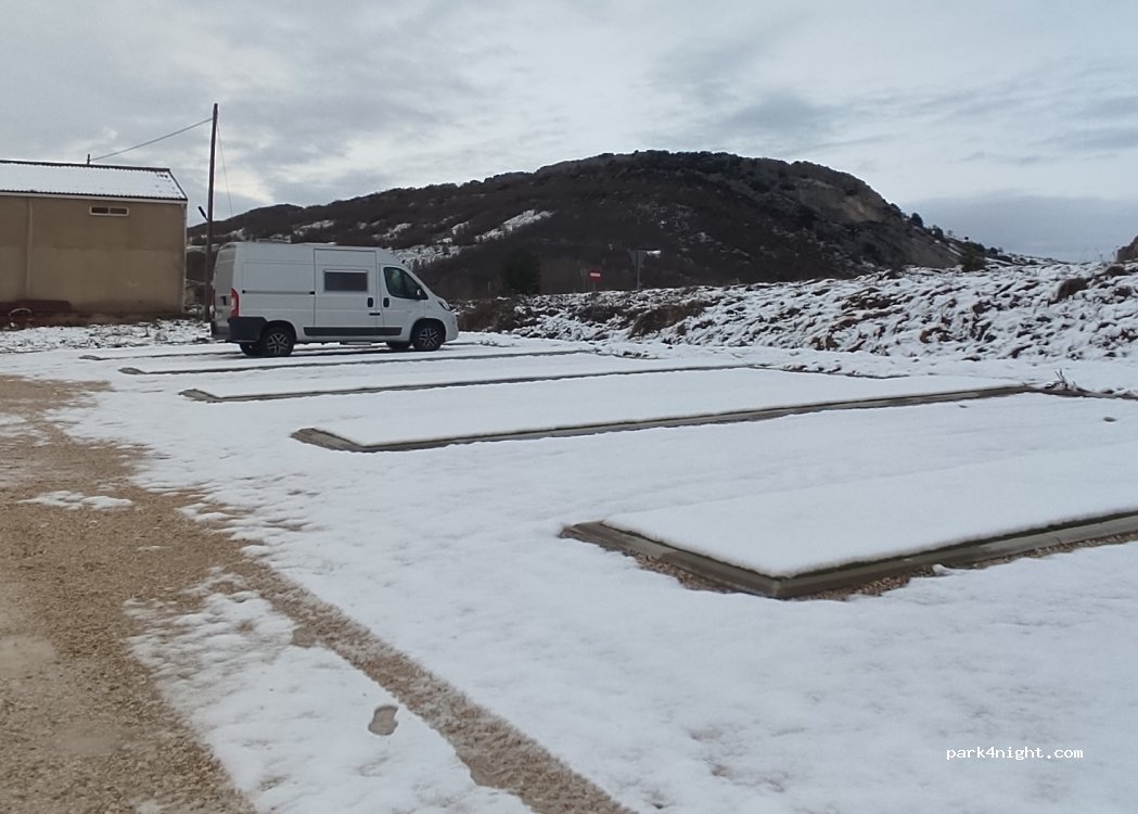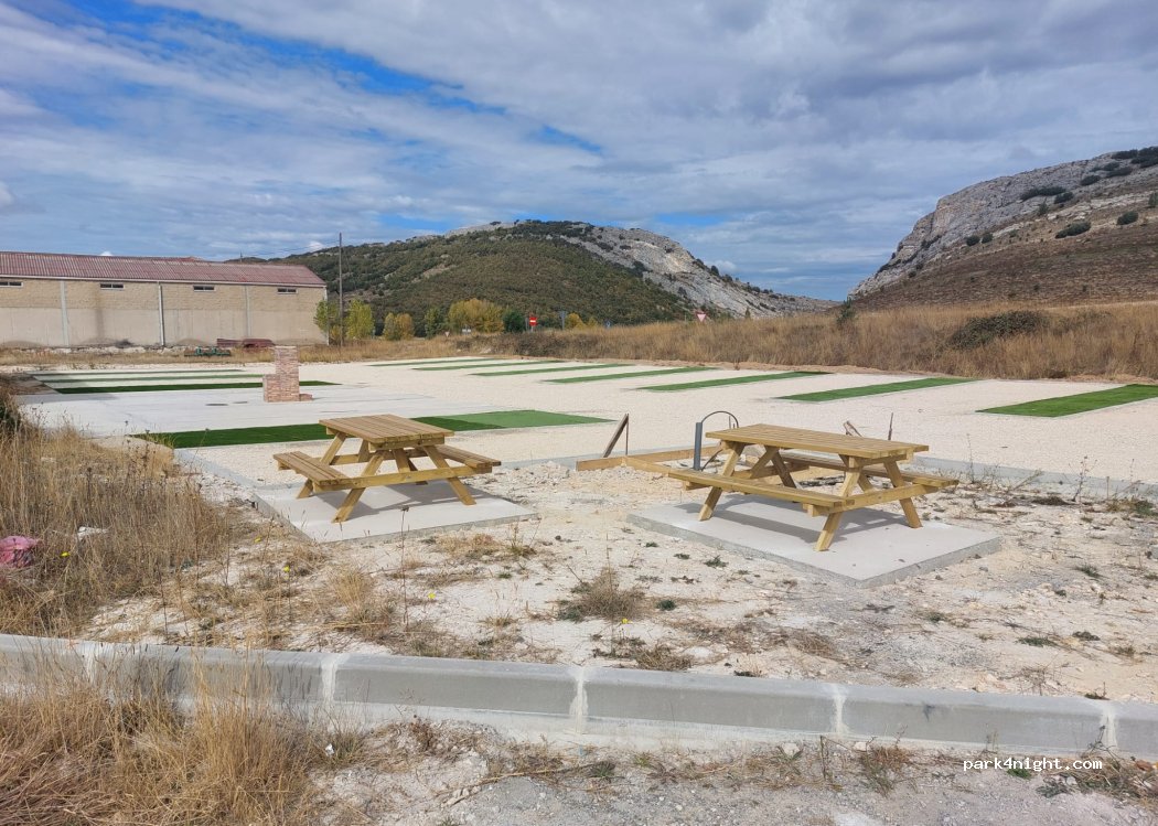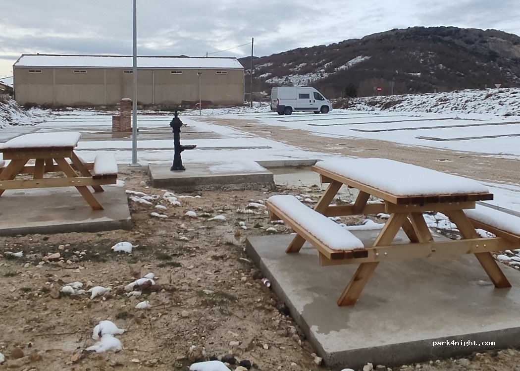 Área de autocaravanas nueva y gratuita. 12 aparcamientos y 2 zonas de descarga. Varias mesas de picnic y una fuente.
