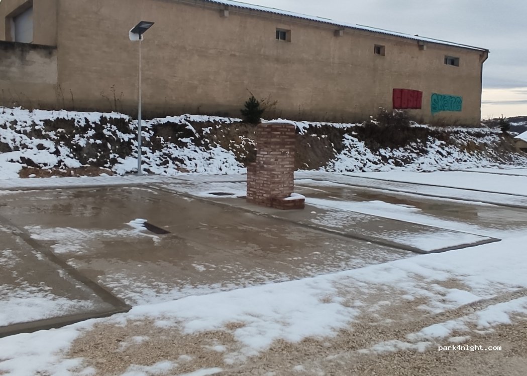 Suelo de grava, plazas niveladas. Buen acceso. Ubicada en zona de naves agrícolas, al lado de la carretera. Pueblo pequeño y tranquilo.
